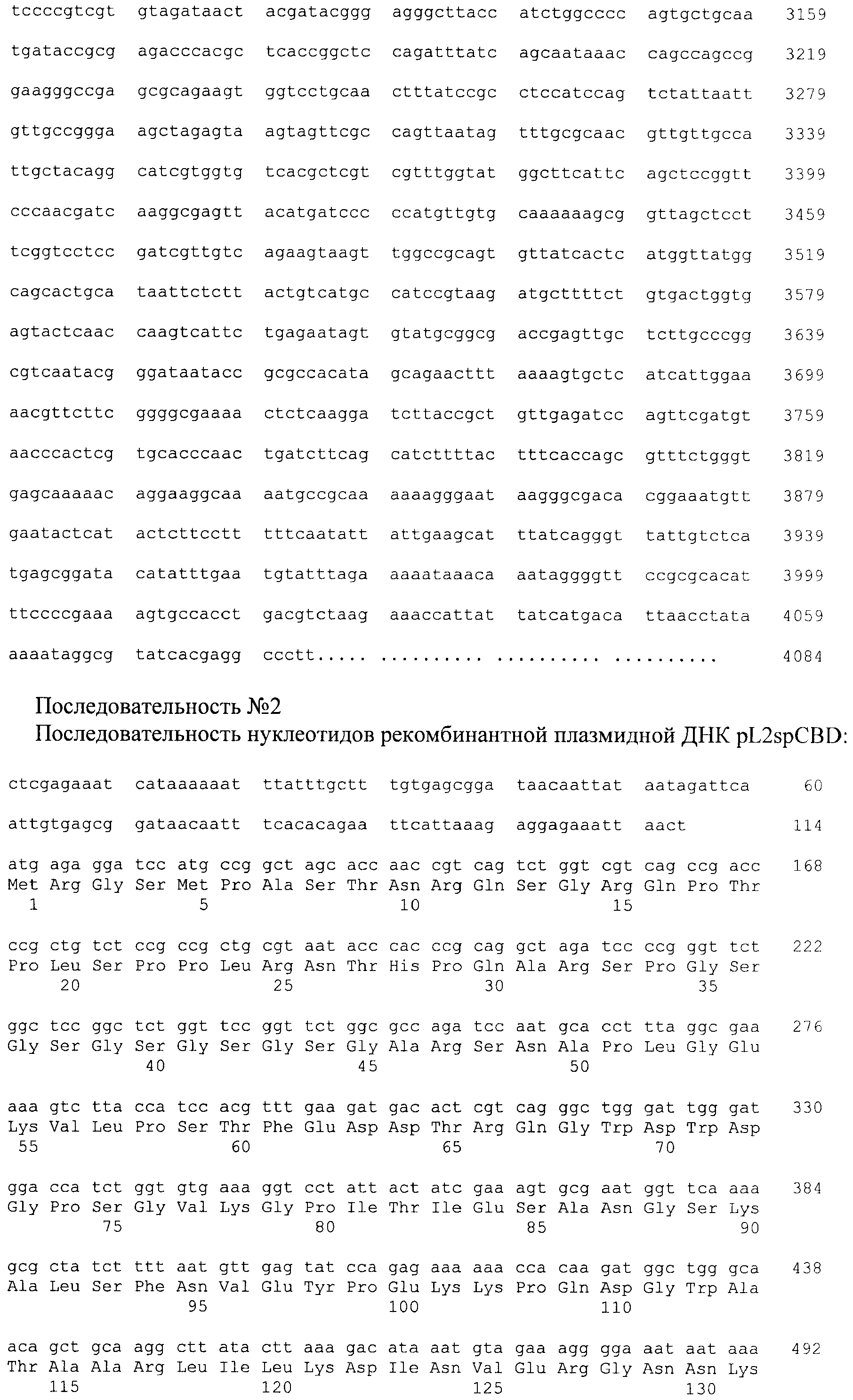 Штаммы-продуценты рекомбинантных белков L1spCBD и L2spCBD получают трансформацией штамма Е.coli M15 [pREP4] плазмидами pL1spCBD или pL2spCBD соответственно. Штаммы обеспечивают продукцию рекомбинантных белков L1spCBD и L2pCBD после проведения процедуры индукции (изопропил- -D-тио-галактопиранозидом) (ИПТГ) до 7-10% от тотального белка клетки.