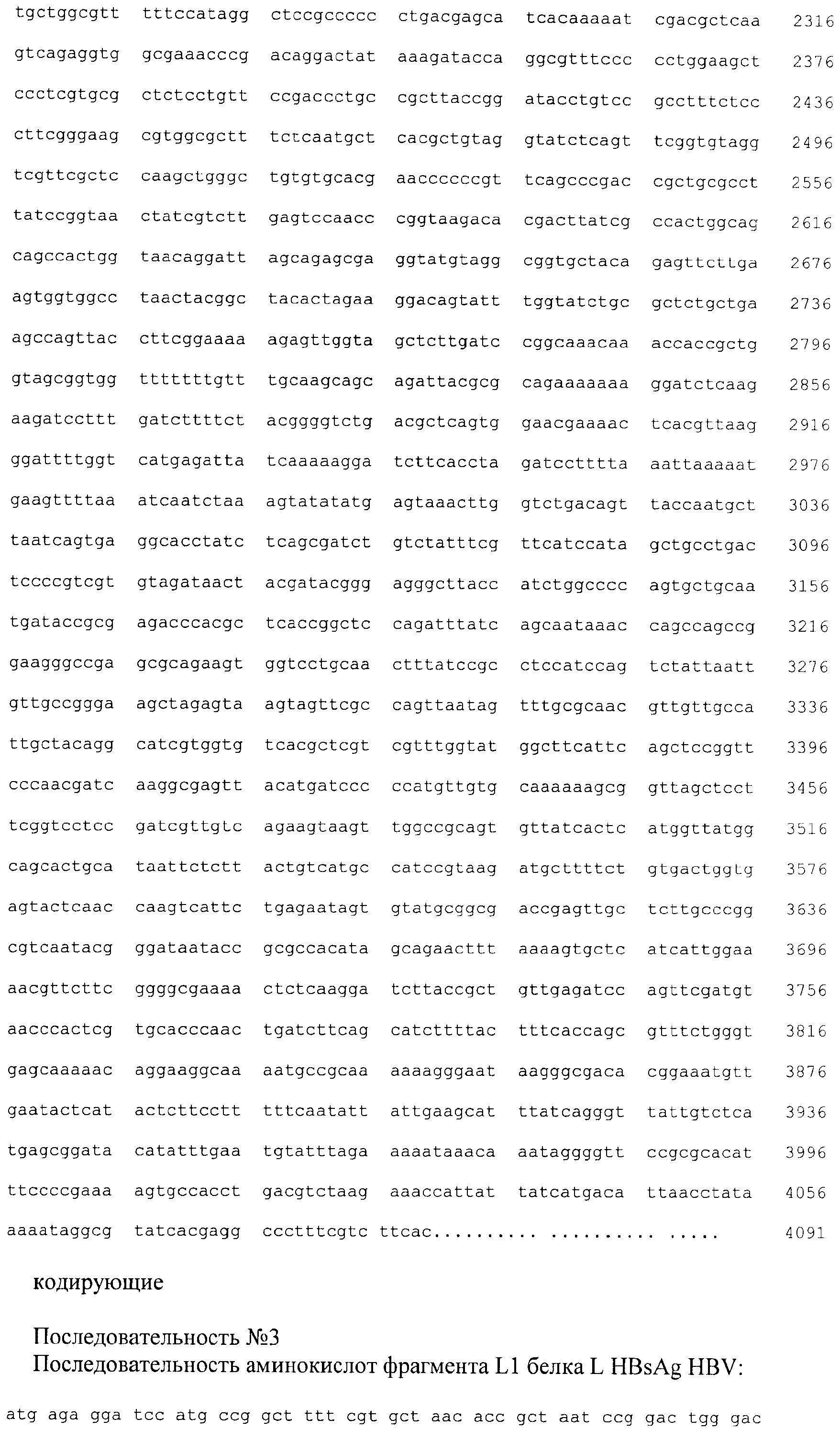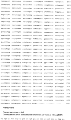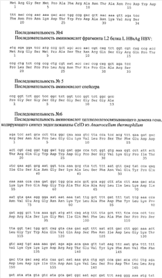 – искусственный бактериальный оперон химерных белков, включающий: промоторную область раннего промотора бактериофага Т5 (7-87 п.н.), обеспечивающий эффективную транскрипцию контролируемой мРНК; рекомбинантный ген, кодирующий целевой химерный белок (домены белка L HBsAg – спейсер – целлюлозосвязывающий домен CBD) (L1spCBD 115-817 п.н. и L2spCBD 115-814 п.н.); нетранслируемую область терминации транскрипции бактериального оперона, обеспечивающую эффективное окончание транскрипции (L1spCBD 857-951 п.н. и L2spCBD 854-948 п.н.);