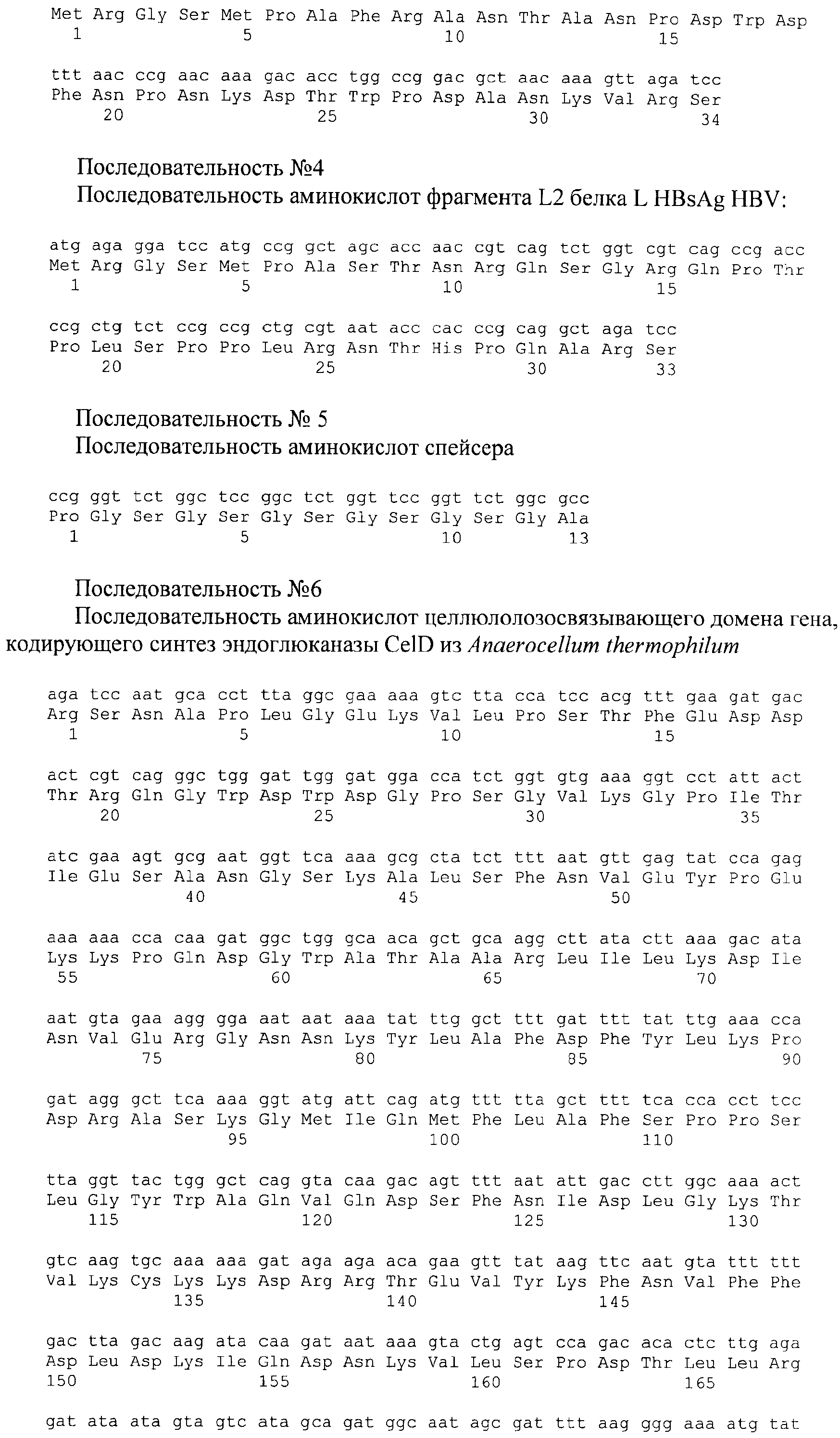 Используя этот подход, получили препараты двухкомпонентных рекомбинантных белков. Первый белковый домен содержит антигенную детерминанту из N-концевой области белка L субтип ayw (детерминанта L1 21-47 аа или L2 83-108 аа), он определяет функциональные (в данном случае антигенные) свойства белка. Далее следует соединяющая (спейсерная) аминокислотная последовательность из нескольких чередующихся остатков глицина и серина. Второй белковый домен содержит фрагмент последовательности гена эндоглюканазы СеlD из термофильного микроорганизма A. thermophilum, он определяет способность белка взаимодействовать с целлюлозным сорбентом. Конечные белковые продукты нарабатываются в непатогенных лабораторных штаммах Е.coli Иммобилизированные на целлюлозе белки представляют собой суспензию целлюлозосодержащего сорбента с адсорбированными на нем белками. Конечные препараты представляют собой растворы белков в буфере с определенной ионной силой, свободные от примесей липополисахаридов и ДНК штамма-продуцента