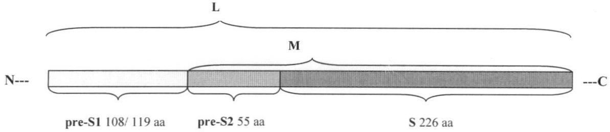 По природе антиген является липопротеином; закреплен в наружной вирусной оболочке. Состоит из трех частей (чертеж): основного белка S (small) размером 226 аминокислотных остатка (аа) и двух протеинов, на N-конце: белка М (middle), состоящего из белка S и области pre-S2 (55 аа); белка L (large), состоящего из белка М и области pre-S1 (119/108 аа). Области pre-S имеют независимые от основного белка S функциональные домены; их рассматривают как самостоятельные единицы, так и в составе HBsAg. Удаление областей не влияет на структуру и иммунохимические свойства HBsAg (Sue DELOS, Maria Teresa VILLAR, Peisheng HU L. PETERSON Cloning, isolation and characterization of the pre-S domains of hepatitis В surface antigen, devoid of the S protein Biochem J. (1991) 276, 411-416).