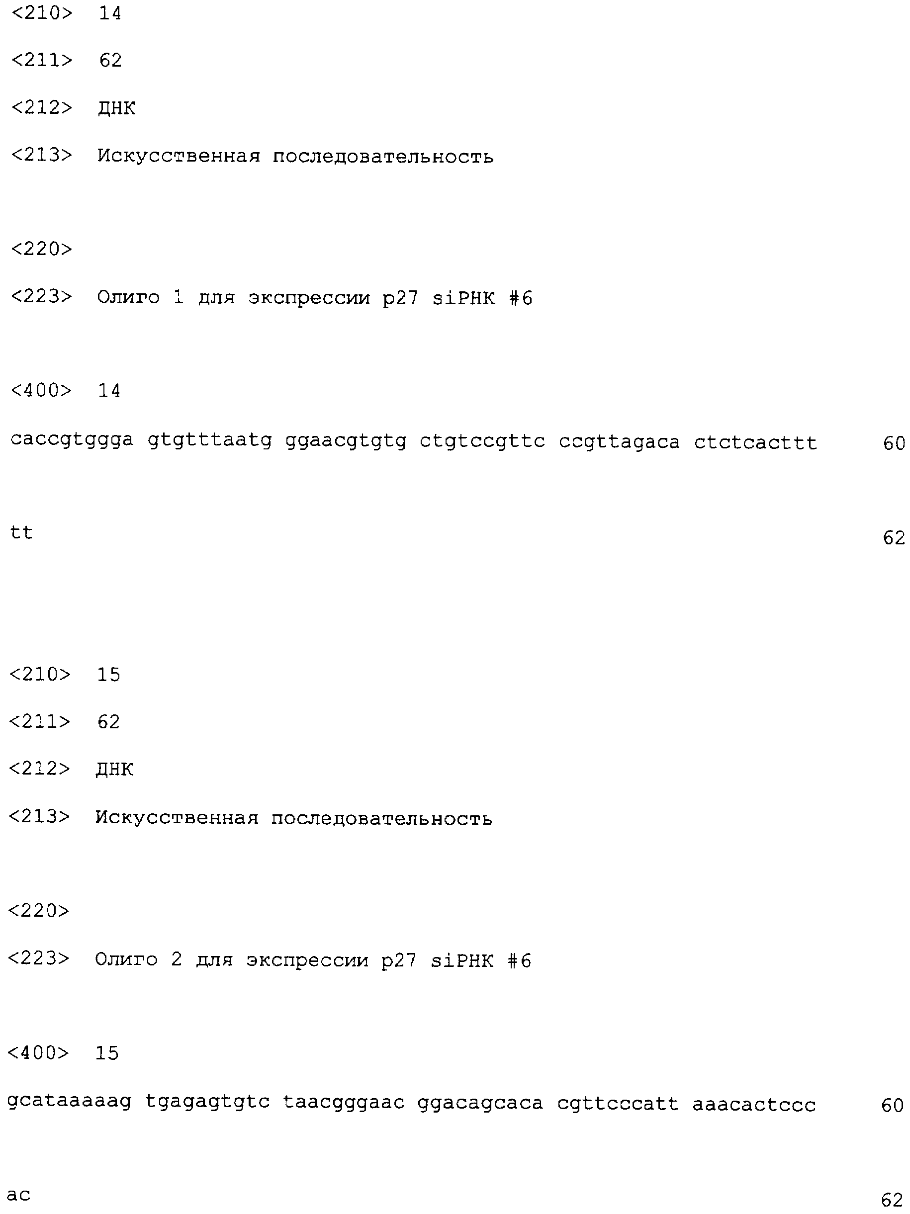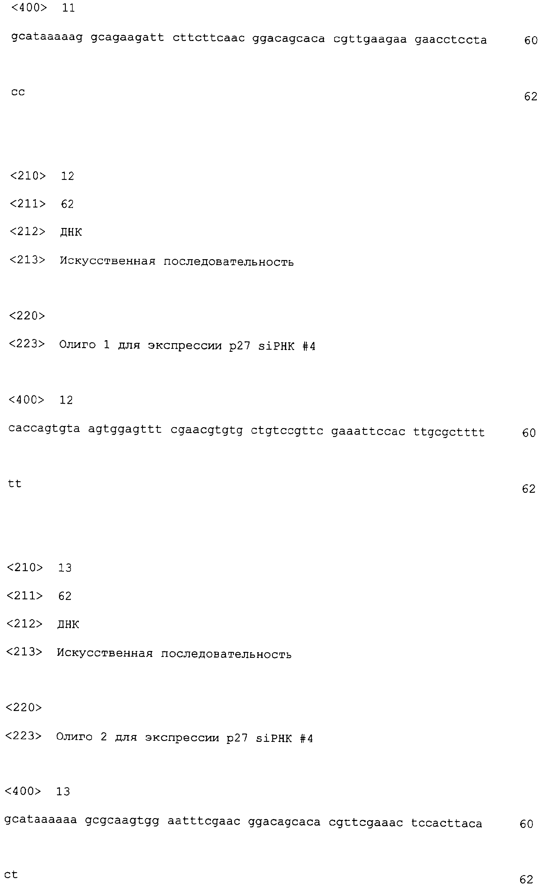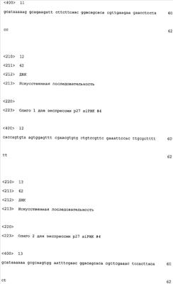 siРНК #4: 5 -CACCAGTGTA AGTGGAGTTT CGAACGTGTG CTGTCCGTTC GAAATTCCAC TTGCGCTTTT TT-3 (SEQ ID NO: 12) и 5 -GCATAAAAAAGCGCAAGTGG AATTTCGAAC GGACAGCACA CGTTCGAAAC TCCACTTACA CT-3 (SEQ ID NO: 13).