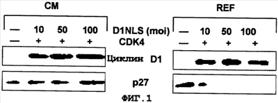 При осуществлении изобретения, кроме того, нуклеотидную последовательность, кодирующую сигнал ядерной локализации, присоединяют, предпочтительно, по меньшей мере к одному из генов циклина или CDK, для введения полученного в результате гена в клетки-мишени. Циклин способен активировать CDK4 или CDK6 и, предпочтительно, включает, например, циклин D1, D2 и D3 млекопитающих. Кроме того, CDK активируется циклином типа D и, предпочтительно, включает, например, CDK4 и CDK6 млекопитающих.