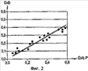 В заводских условиях (правая часть) измеренные точки также в основном укладываются на очень близкую к прямой линию (выделенную на фигуре). С обеих сторон наблюдается некоторый разброс, который, однако, остается ограниченным в пределах почти прямолинейной полосы шириной 0,02 единицы. Это свидетельствует о неизбежных возмущениях в промышленных условиях, но которые ни в коем случае не снижают надежности методики.