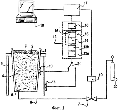 С помощью этого первого индикатора барботирования имеется возможность установить второй индикатор, который свидетельствует о состоянии закупорки пористой заглушки. Для этой цели измеряют сигналы, поступающие от регулятора давления и расходомера (ни тот, ни другой не показаны) подающего вентиля 7 на пористую заглушку 5 так, чтобы получить фигуру, соответствующую расходу потока аргона, теоретически вводимого в ковш. Это измерение данных проводится совместно с измерением вибрационного сигнала ковша датчиком 10 (или 11). С помощью пульта 18 управления оператора эти разные данные передаются затем на компьютер 17 (который содержит базу данных по производству, относящуюся к рассматриваемому цеху, в данном случае к установке внутриковшевой обработки) с целью анализа, обеспечивающего, таким образом, обнаружение в режиме реального времени утечки газа или частичной закупорки пористой заглушки. Было бы полезно соединить компьютер с системой 19 для автоматического регулирования расхода потока аргона путем регулирования степени открытия вентиля 7 с целью изменения потока перемешивающего газа.