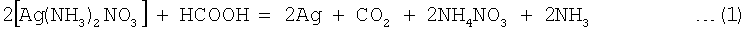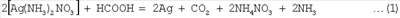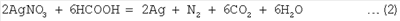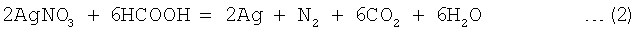 Пример 2. Навеску 50 г соли, полученной в опыте, описанном в примере 1, растворили в смеси 20 мл воды и смешали с 20 мл водного раствора аммиака (весовое отношение массы аммиака к массе серебра 0.17) до установления рН 5, раствор отделили от взвеси. Выход взвеси ярко-синего цвета составил 0.31 г. К бесцветному фильтрату добавили 20 мл водного раствора аммиака, доведя весовое отношение массы аммиака к массе серебра до 0.34, после чего его нагрели до 70°С и при этой температуре обработали добавкой 125 см3 раствора сернистокислого натрия концентрацией 250 г/л (до установления потенциала 60 мВ относительно хлорсеребряного электрода сравнения). Продукты восстановления разделили фильтрованием, получив 22.09 г серебра. Фильтрат нагрели до 100-110°С и при этой температуре выдержали в течение 30 мин, после чего образовавшуюся массу разбавили водой и разделили фильтрованием. При этом получили дополнительное количество (вторую фракцию) – 2.16 г серебряного осадка и 110 см3 раствора на основе сульфата натрия и нитрата аммония. Обе фракции восстановленного серебра отмыли 2-молярным раствором соляной кислоты при температуре 60°С и перемешивании, получив при этом 70 см3 промывных вод. Содержание компонентов в отмытой первой фракции серебра составило, %: основного – 99.995, меди – 0.0003, свинца – 0.0008, цинка – 0.0005, селена – 0.0003. Вторая фракция отличалась от первой несколько лишь более низким содержанием свинца (0.0006%), но настолько же большим селена (0.0005%). Из конечного раствора выделили остаточное серебро в виде хлорида (6.2 г). Промывные воды использовали в качестве соляной кислоты для отмывки следующих образцов восстановленного серебра. Пример 3 Исходный продукт – соли на основе нитрата серебра, полученные из серебряно-золотого концентрата по ходу проведения опыта, описанного в примере 1. Навеску 50 г этой соли растворили в воде и смешали с водным раствором аммиака, аммиачно-нитратный раствор отфильтровали от взвеси, в фильтрат добавили дополнительное количество водного раствора аммиака (все точно также, как в примере 2). Аммиачно-нитратный фильтрат, характеризующийся весовым отношением массы аммиака к массе серебра 0.34, нагрели до температуры 60°С и при этой температуре и перемешивании обработали добавкой 25 см3 муравьиной кислоты. Продукты восстановления серебра разделили фильтрованием, осадок на фильтре промыли водой. После фильтрования и отмывки получили 27.4 г серебра и 180 см3 конечного раствора на основе нитрата аммония. Одну часть полученного серебряного осадка анализировали спектральным методом анализа, три других перед проведением анализа подвергли дополнительным операциям отмывки водой, или водным раствором аммиака, или 2-молярным раствором соляной кислоты. Результаты анализа полученных серебряных порошков представлены в табл.2