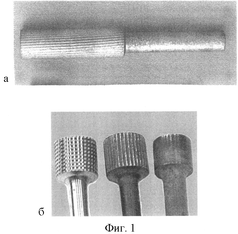 Пример 1. Мелкоразмерные концевые фрезы шлифования и торцевания заготовок из пиролитического нитрида бора ПНБ для катодных блоков ЭРД МТ изготовляются по предложенному способу. Вначале при механической обработке шлиффрез на рабочей части формировали накатку по трем вариантам рельефного профиля (фиг.1б) продольного, продольно-поперечного и комбинированного. Затем осуществляли карбонитрирование при температуре закалки 900°С в течение 4 часов с загрузкой по схеме «контейнер в контейнере» в порошковый древесно-угольный состав, содержащий активированный древесный уголь 50 мас.% по ГОСТ 20464-73, активаторы – карбамид (NH2)2CO 25 мас.% по ГОСТ 6691-77 и трилон-Б (C10H8O10)Na2N2 25 мас.% ГОСТ 10652-73.