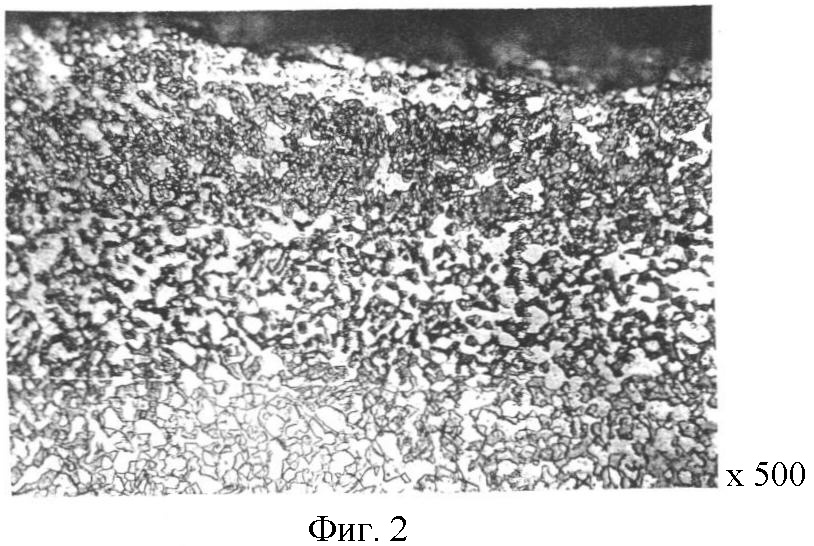 При проведении обработки при параметрах техпроцесса за пределами заявляемых положительный эффект существенно снижался. Так, повышение времени выдержки более 4 часов и температуры карбонитрирования выше 910°С вызывало рост зерна сердцевины, снижение ударной вязкости и прочности основы. Удлинение времени старения с одновременным карбонитрированием вызывало охрупчивание поверхностей зоны слоя и выкрашивание при динамическом нагружении. При изменении соотношения угля древесного, трилона-Б, карбамида в сторону увеличения добавок нарушается баланс реакций в сторону увеличения количества двуокиси углерода, усиливается поверхностное окисление. При уменьшении количества добавок-активаторов ниже выбранного снижается азотный потенциал среды и степень насыщения слоя карбидами титана.