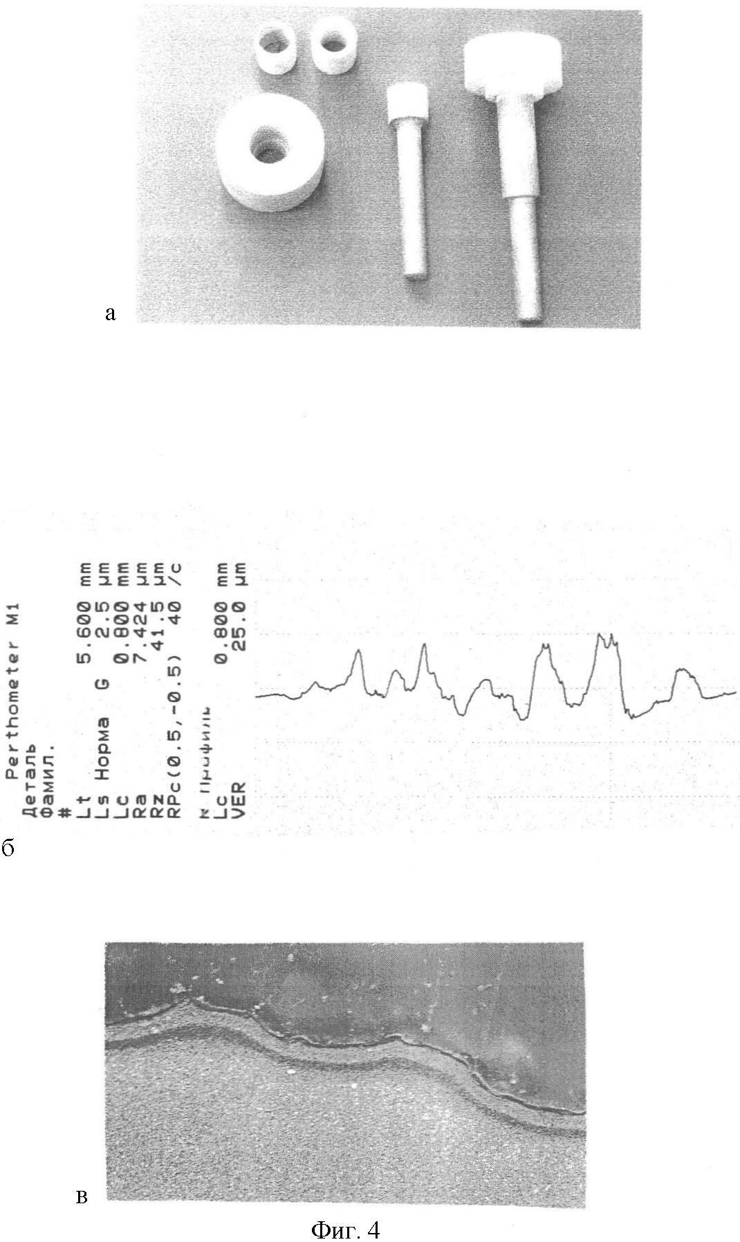 На фиг.4б показан внешний вид деталей из керамики БГП и концевые фрезы из сплава ВТ6, упрочненные по предложенному способу, при чистоте поверхности после АСО обработки и старения с одновременным карбонитрированием на уровне Ra=7,424 мкм (фиг.4в). Идентичные фрезы, изготовленные по известному способу, теряли режущие свойства вследствие засаливания и натирания режущей части втрое быстрее, чем по предложенному способу.