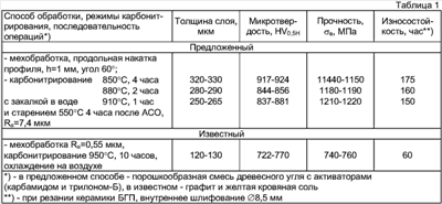 в=1180-1200 МПа. Инструмент имел износостойкость на уровне абразивного круга из электрокорунда и в 2,4 раза выше титанового, обработанного по известной технологии, при температурах процесса 1000°С, без закалки и старения. Исключена хрупкость слоев и основы. Чистота обработки керамики БГП повысилась на два класса стандартной шкалы, производительность резанья увеличилась на 35%. В таблице 1 приведены свойства титанового сплава ВТ-6 при упрочнении по предложенному и известному способам.