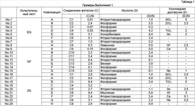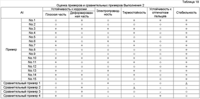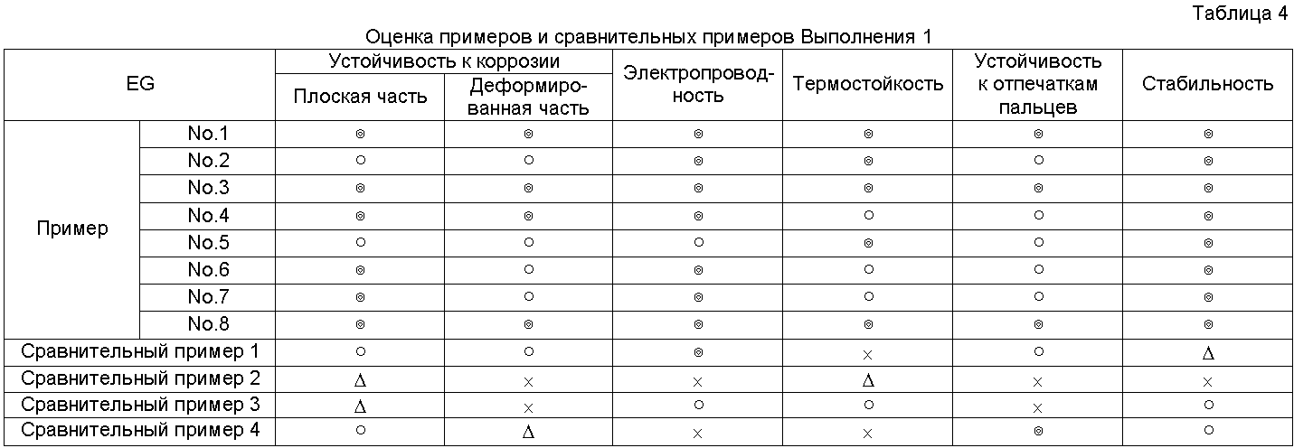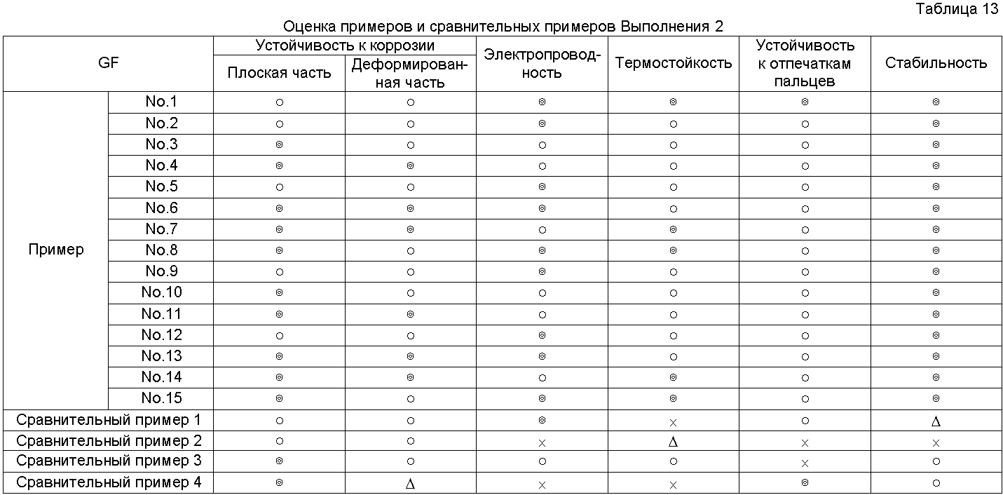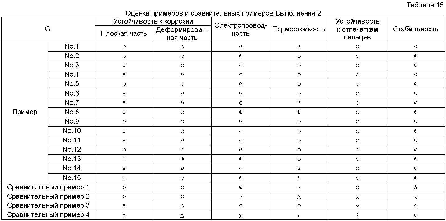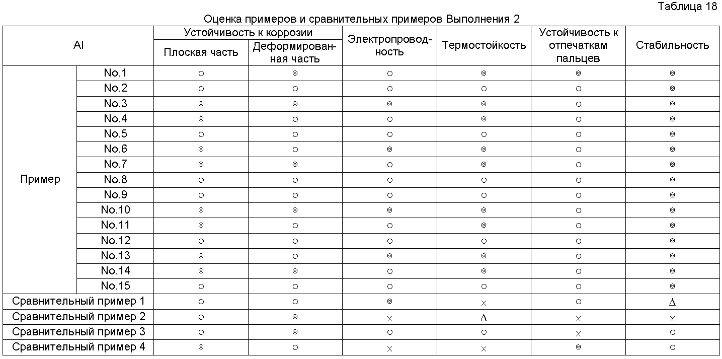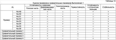 × = Гелирование менее чем через 60 дней Результаты оценки испытаний Результаты испытаний в соответствии с Выполнением 1 представлены в Таблицах 4-10. Очевидно, что средства обработки Примеров 1-56 в Таблицах 1-3 чрезвычайно стабильные и проявляют устойчивость к коррозии, равную для хроматного, электрическую проводимость и термостойкость, равную или выше, чем такие же характеристики неорганической системы, и устойчивость к отпечаткам пальцев равна устойчивости органических систем. Результаты испытаний в соответствии с Выполнением 2 представлены в Таблицах 12-18. Очевидно, что средства обработки Примеров 1-15 в Таблице 11 чрезвычайно стабильны и проявляют устойчивость к коррозии, равную для хроматного, электрическую проводимость и термостойкость, равную или выше, чем такие же характеристики неорганической системы, и устойчивость к отпечаткам пальцев равна устойчивости органических систем.
