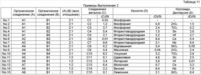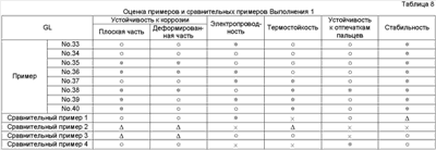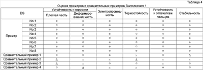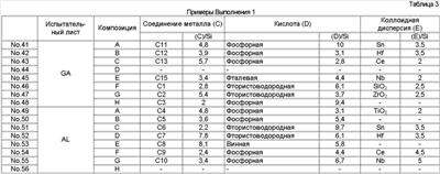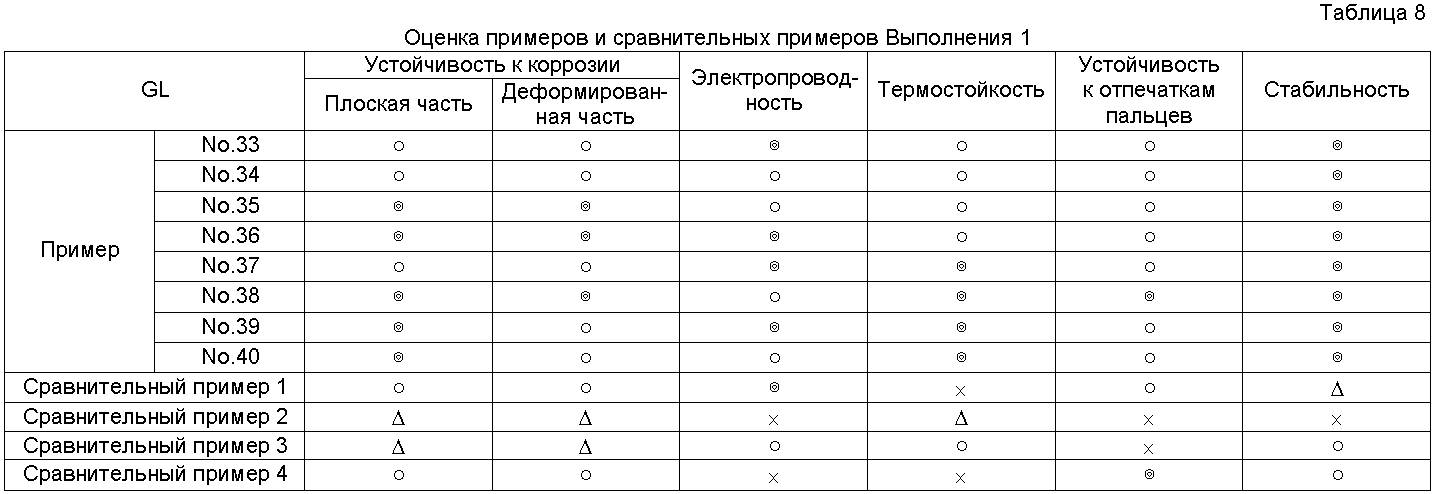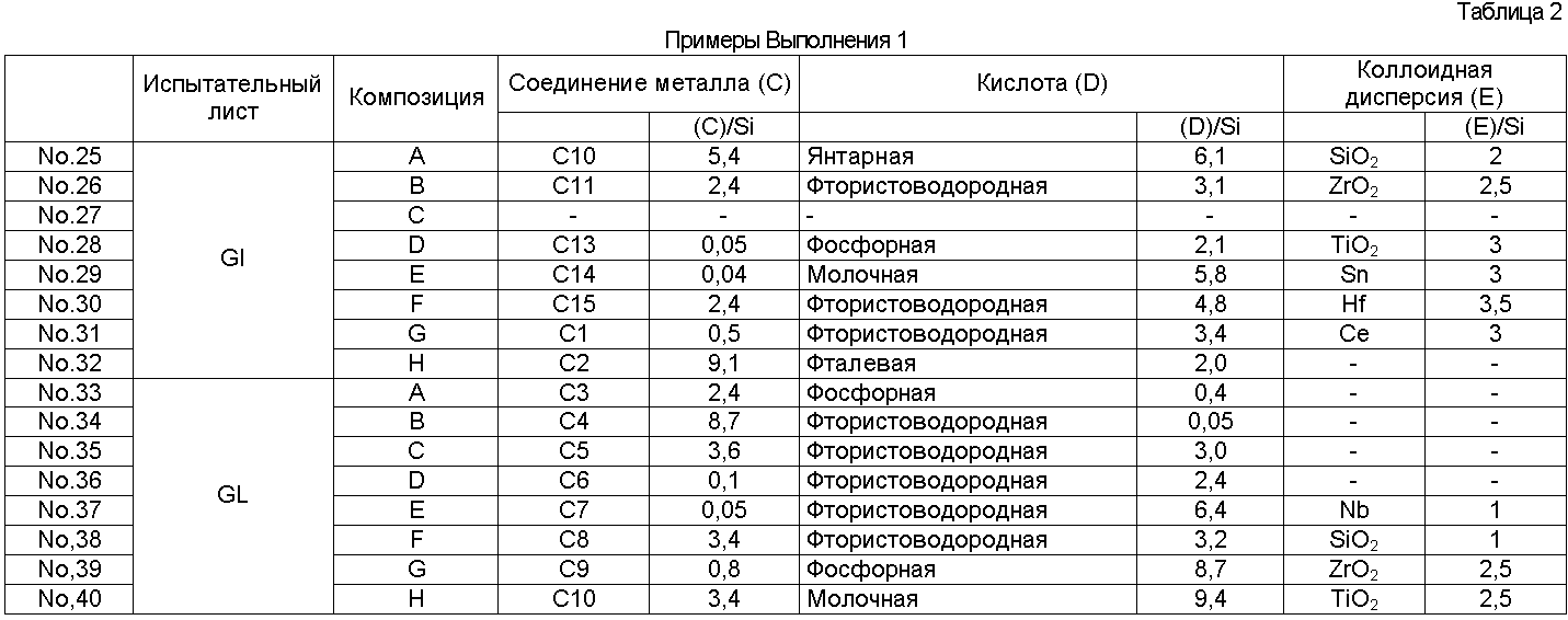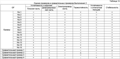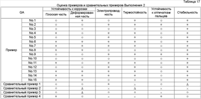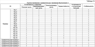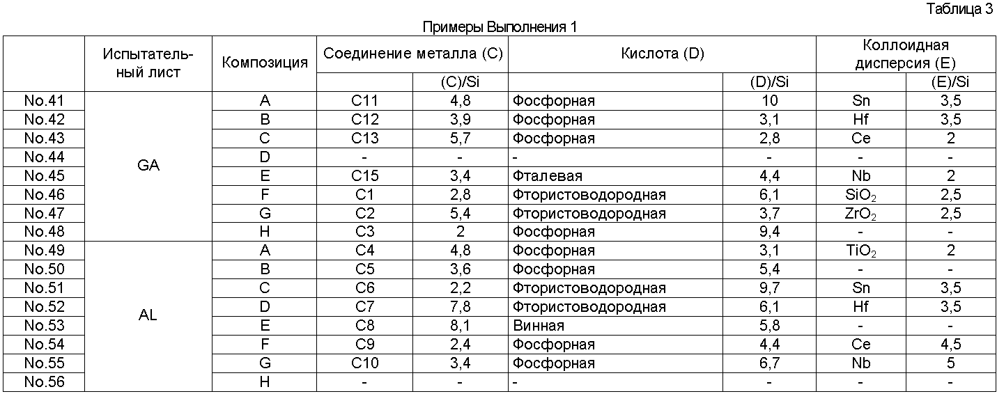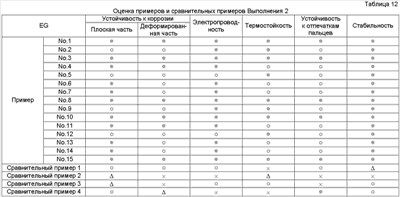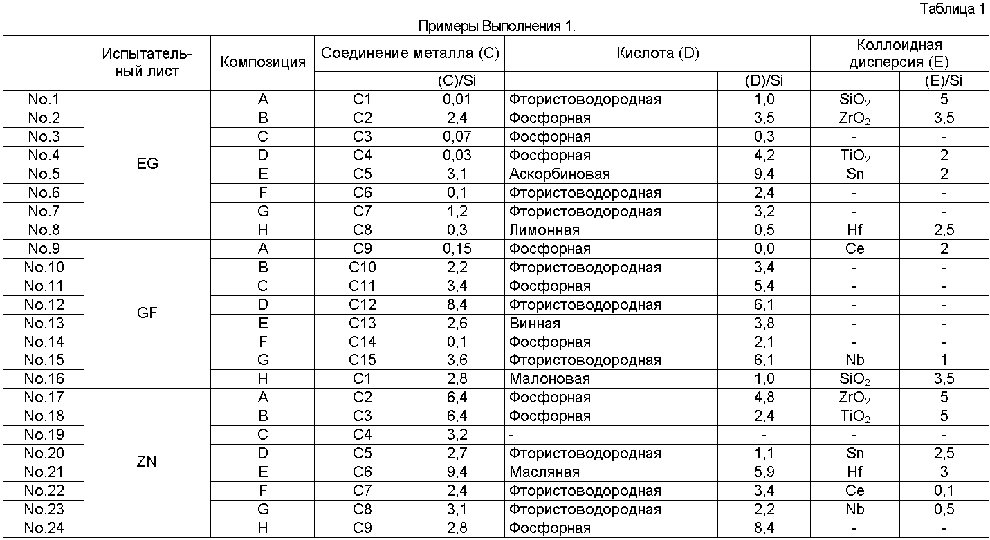 × = Гелирование менее чем через 60 дней Результаты оценки испытаний Результаты испытаний в соответствии с Выполнением 1 представлены в Таблицах 4-10. Очевидно, что средства обработки Примеров 1-56 в Таблицах 1-3 чрезвычайно стабильные и проявляют устойчивость к коррозии, равную для хроматного, электрическую проводимость и термостойкость, равную или выше, чем такие же характеристики неорганической системы, и устойчивость к отпечаткам пальцев равна устойчивости органических систем. Результаты испытаний в соответствии с Выполнением 2 представлены в Таблицах 12-18. Очевидно, что средства обработки Примеров 1-15 в Таблице 11 чрезвычайно стабильны и проявляют устойчивость к коррозии, равную для хроматного, электрическую проводимость и термостойкость, равную или выше, чем такие же характеристики неорганической системы, и устойчивость к отпечаткам пальцев равна устойчивости органических систем.