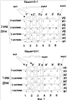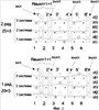 На фиг.2. приведен график прокладывания нитей двух комплектов петлеобразующих систем – ряд 1 и ряд, 2 каждый из которых состоит из четырех вязальных систем Z0=4. Раппорт выключения игл по изнаночной стороне Rвыкл показывает аналогично фиг.1, сколько игл подряд работает + сколько последующих игл выключено из работы. Нити проложены таким образом, что на иглах задней игольницы образуются две петли в двух соседних петельных столбиках, а следующая игла выключается из работы и в смежных петельных столбиках передней и задней игольниц нить одного и того же цвета не прокладывается. Прокладывание нити на иглы задней игольницы зависит от рисунка на лицевой стороне трикотажа.