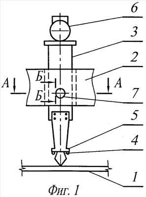 Стержень 3 снабжен осью 7. Ось 7 расположена выше трамбующей плиты 5 (это обусловлено тем, что стержень до трамбующей плиты погружается в балласт и расположение оси ниже трамбующей плиты привело бы к необходимости ее защиты от абразивного воздействия балласта и усложнило бы конструктивное выполнение приспособления) и расположена поперек по отношению к стержню 3, т.е. при вертикальном стержне 3 ось 7 занимает горизонтальное положение. Ось 7 может быть запрессована в тело стержня 3, т.е. соединена с ним жестко, или установлена в стержне 3 с возможностью шарнирного поворота, в подшипниках. Относительно несущей балки 2 ось 7 также может быть как закреплена жестко, так и установлена с возможностью поворота, в подшипниках. Это обеспечивает возможность стержню поворачиваться относительно оси 7, относительно несущей балки 2, или одновременно поворачиваться относительно оси 7 и несущей балки 2. При этом положение оси 7 должно быть таким, чтобы обеспечить качание стержня 3 преимущественно в плоскости, параллельной плоскости действия вынуждающей силы вибровозбудителя 6, т.е. при установке на приспособление дебалансного вибратора ось 7 должна быть преимущественно параллельна оси вибратора. Очевидно, что для передачи горизонтальных колебаний на балласт уплотнительная лопатка 4 виброинструмента также должна быть ориентирована так, чтобы ее рабочая поверхность (т.е. плоскость лопатки), предназначенная для перемещения балласта, была расположена параллельно оси 7. Такое взаимное положение оси 7 и уплотнительной лопатки 4 по отношению к плоскости действия вынуждающей силы вибровозбудителя 6 позволяет за счет качания стержня 3 практически без потерь передать на балласт горизонтальную составляющую виброколебаний. Расположение оси 7 в середине стержня по его длине позволяет добиться значительного горизонтального воздействия на балласт уплотнительной лопатки 4 при сравнительно небольшой мощности вибровозбудителя 6.
