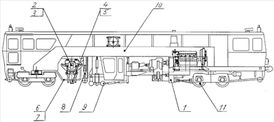 На чертеже изображена машина для реализации предложенного способа выправки. Работает изделие следующим образом. Включают привод 1 и подъезжают к первой шпале. Опускают вниз подбивочные блоки (правый и левый) 2 и 3 и производят подбивку и выправку пути. Причем рельсы поднимают на 2-25 мм выше проектного («0») уровня. После окончания сжима (подбойки подошли вплотную к шпале) включают подъем подбивочных блоков и включают гидроцилиндры 4, 5, которые прижимают рельсошпальную решетку к балласту. Время работы, величину усилия опускания правого и левого рельсов от действия гидроцилиндров 4, 5 регулируют для обеспечения установки пути в проектное положение за время от окончания сжима до начала перемещения подбивочных блоков на один шаг, до следующей зоны выправки. Значение прижимного усилия составляет 35-100 т и более. Во время включения гидроцилиндров 4, 5 подвижные рамы 6, 7 (внутри которых подбивочные блоки могут перемещаться вертикально вверх-вниз, а сами рамы 6, 7 вместе с блоками 2, 3 могут перемещаться поперек пути) представляют собой жесткую опору для передачи усилий от приводов гидроцилиндров 4, 5. После подъема подбивочных блоков в верхнее положение, отключают гидроцилиндры (правый, левый) прижима 4, 5, включают механизм передвижения 1 и переезжают к следующей шпале. Управляют выправкой, величиной заданной переподъемки, установкой в проектное положение с помощью сигналов контрольно-измерительной системы 8, передаваемых на исполнительные органы (гидроцилиндры) подъемно-рихтовочного-(стабилизирующего) устройства 9. Машина содержит раму 10, опирающуюся на ходовые тележки 11.