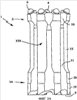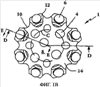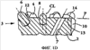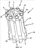 На заднем конце бурового долота, т.е. конце, в общем, обращенном от конца бурового долота, удаляющего породу, имеются задние зубья 9, которые расположены у максимального диаметра бурового долота и проходят радиально внутрь от него. Назначение заднего конца бурового долота заключается в обеспечении направления бурового долота 1 в стволе скважины посредством частей, расположенных в связи с концами бурового долота 1 и в уменьшении сопротивления удалению обломков выбуренной породы. Канавки 10, 11 для обломков выбуренной породы предназначены для отвода буровой пыли, произведенной у передней части бурового долота 1. Окружная наружная поверхность юбки образована разнесенными по окружности канавками 11, образующими между собой грани 15. Буровое долото 1 в своей средней части имеет сужение 15А. Размер сужения 15А меньше, чем диаметр задней части 1А, которой направляется буровое долото. Сужение 15А может содержать канавки 11 или может быть по существу гладкой, как, например, иметь цилиндрическую форму. Канавки и грани, в общем, проходят в осевом направлении. Задняя по направлению оси часть, по меньшей мере, одной грани 15 имеет направляющую поверхность, которая обращена радиально наружу. Направляющая поверхность содержит первую направляющую часть 19 и вторую направляющую часть 20, расположенные радиально наружу от воображаемой линии 21, проходящей от сужения 16А. Относительно центральной оси CL бурового долота первая направляющая часть 19 выступает радиально наружу дальше, чем вторая направляющая часть 20. Каждая направляющая часть 19, 20 имеет форму части цилиндрической поверхности. Первые направляющие части 19 определяются первым диаметром DG1, а вторые направляющие части 10 – вторым диаметром DG2. Диаметр головки на 3-6%, предпочтительно почти на 4% больше первого диаметра DG1 первых направляющих частей 19. Воображаемые линии от направляющих частей 19, 20 пересекают периферийный вставной зуб 6.