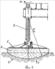 Предлагаемое устройство работает следующим образом. Опору 1 сферической выпуклой формы радиусом Rсф. гидравлического домкрата 1 (фиг.1) или плоской формы (фиг.3) через подкладку 6 со сферической выпуклой формой выдвигают до упора (фиг.1, 3) с погружением сферической опорной поверхности в грунтовое или торфяное основание, характеризующееся углом – внутреннего трения и удельным сцеплением – с. Для обеспечения упругого контактного взаимодействия опор 1 домкратов 2 сферической выпуклой формы с грунтовым или торфяным основанием радиус выпуклости сферы принимают равным где F – площадь опорной поверхности при угле полуконтакта сферы с основанием под расчетной нагрузкой – для грунта и – для торфа, при этом упругое контактное взаимодействие опор домкрата с основанием обеспечивает принятая площадь F опорной поверхности домкратов 2 при радиусе отпечатка сферы в плане и упругой ее осадке где – критическое давление под центром сферы для грунта, – давление структурной прочности на сжатие торфа.