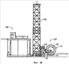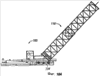 На фиг.10А и 10B показана складная мачта 118, которую поднимают в заданное положение относительно передвижной установки 100. Мачта 118 может быть поднята в вертикальное положение и опущена в горизонтальное положение при помощи различных систем, хорошо известных сами по себе, в том числе при помощи двух гидравлических цилиндров двойного действия, имеющих три ступени. Система управления обоими гидравлическими устройствами может находиться на панели управления оператора, расположенной в непосредственной близости от секции основания мачты 118. Верхние секции мачты 118 защелкиваются в нижних секциях. В качестве дополнительного предохранительного устройства может быть использован ручной фиксатор. Защелки обеспечивают легкий визуальный контроль надлежащего функционирования из положения на земле. В качестве дополнительных предохранительных средств могут быть использованы отверстия в подъемных цилиндрах, которые позволяют управлять скоростью опускания мачты в случае отказа гидравлической системы во время монтажа или демонтажа установки.