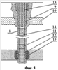 После определения интервала негерметичности 8 эксплуатационной колонны 9 скважины и характера повреждения эксплуатационной колонны 9 скважины проводят замену облегченного солевого раствора на свежеприготовленный солевой раствор, например на солевой раствор хлоркалия электролита следующего состава, мас.%: хлорид калия 60-68, хлорид магния 4-9, хлорид натрия 12-24, хлорид кальция 1,2-2,4, вода – остальное, или водный раствор хлорида кальция с расчетной плотностью, обеспечивающей создание противодавления на пласт. Затем под интервалом негерметичности 8 эксплуатационной колонны 9 скважины устанавливают висячий изолирующий цементный мост 14 и проводят закачивание через интервал негерметичности 8 эксплуатационной колонны 9 скважины за эксплуатационную колонну 9 скважины тампонажного материала, например цементного раствора, или герметизирующей композиции.