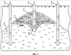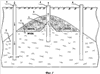 Сущность предлагаемого способа заключается в разработке нефтяного пласта с использованием двух последовательно чередующихся режимов работы, обеспечивающих повышение эффективности добычи нефти. Первый режим работы поясняется фиг.1, второй – фиг.2. На нефтяной залежи 1, подстилаемой водой 2, имеются отдельные участки с повышенными гипсометрическими отметками кровли продуктивного пласта 3. На повышенных участках структуры располагают нефтедобывающие скважины 4, которые перфорируют в прикровельном интервале пласта и ниже водонефтяного контакта. На склонах пласта-коллектора располагают нагнетательные скважины 5 и добывающие скважины 6, предназначенные для нагнетания и отбора вытесняющего агента. Нагнетательные скважины 5 и добывающие скважины 6 перфорируют ниже текущего положения водонефтяного контакта. Первоначальный режим работы предусматривает эксплуатацию пласта нефтедобывающими скважинами 4 через интервал перфорации в прикровельной части пласта, при этом осуществляют нагнетание вытесняющего агента через нагнетательные скважины 5. Эксплуатация в таком режиме с течением времени приводит к подтягиванию конуса воды 7 к прикровельному интервалу пласта и обводнению нефтедобывающих скважин 4. При подтягивании конуса воды 7 к прикровельному интервалу пласта переходят ко второму режиму работы, предусматривающему форсированный отбор жидкости нефтедобывающими скважинами 4 через интервал перфорации, расположенный ниже водонефтяного контакта, при одновременном нагнетании вытесняющего агента через нагнетательные скважины 5 и отборе вытесняющего агента через добывающие скважины 6. При этом устанавливают темп отбора, превышающий темп закачки. Эксплуатацию пласта нефтедобывающими скважинами 4 через интервал перфорации в прикровельной части пласта или через интервал перфорации, расположенный ниже водонефтяного контакта, обеспечивают, например, за счет применения известного оборудования для раздельной эксплуатации пластов [Патент RU 2291953, МПК Е21В 43/14, 47/00, опубл. 20.01.2007 г., или Патент RU 60982, МПК Е21В 43/14, опубл. 10.02.2007 г.]. Оборудование для раздельной эксплуатации пластов на фиг.1 и фиг.2 не показано. Отбираемую из добывающих скважин 6 продукцию, воду с небольшим содержанием нефти, направляют на подготовку (не показано) и после отделения нефти повторно закачивают через нагнетательные скважины 5 в обводненную зону разрабатываемого пласта. За счет интенсивной циркуляции воды в пласте-коллекторе между нагнетательными 5 и добывающими 6 скважинами происходит вымывание остаточной нефти из низкопроницаемых, слабодренированных зон. При форсированном отборе жидкости нефтедобывающими скважинами 4 через интервал перфорации, расположенный ниже водонефтяного контакта, и превышении темпа отбора через добывающие скважины 6 над темпом закачки через нагнетательные скважины 5 происходит снижение давления в водонасыщенной части пласта, конус воды 7 под действием притока нефти из верхней нефтенасыщенной части пласта оттесняется от перфорационных отверстий в прикровельном интервале пласта к перфорационным отверстиям, расположенным ниже водонефтяного контакта. При этом образуется обратный нефтяной конус 8, ориентированный в сторону перфорационных отверстий, расположенных ниже водонефтяного контакта. Второй режим работы использую
