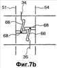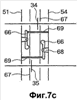 В некоторых вариантах осуществления может быть предусмотрен механизм быстрого закрытия; различные варианты осуществления механизма быстрого закрытия показаны на фиг.7а-7с. На фиг.7а-7с показаны варианты осуществления механизма быстрого закрытия, которые содержат, по меньшей мере, один рычаг 66, установленный между подпружиненным листом 51 и подпружиненным листом 54. Рычаг 66 может быть присоединен с возможностью поворота к опоре 68 для рычага на одном конце, так что один конец рычага будет зафиксирован, или рычаг 66 может быть присоединен с возможностью поворота к опоре 68 для рычага в середине рычага, так что оба конца будут подвижными относительно поворотного соединения. Опора 68 для рычага прикреплена к подпружиненному листу 54. Пределы перемещения рычага 66 ограничены упорами 34 и 35. Толкатель 69 прикреплен к противоположному подпружиненному листу 51. Следует отметить, что в используемом здесь смысле термин “толкатель” используется для описания штанг, которые или толкают, или тянут, или выполняют оба эти действия. Когда рычаги 20а и 20b отводятся, подпружиненные листы 51 и 54 перемещаются по направлению друг к другу, и толкатель 69 входит в контакт с рычагом 66. При приближении подпружиненных листов 51 и 54 друг к другу рычаг 66 входит в контакт с упором 34, и толкатель 69 продолжает давить на рычаг 66. Это приводит к возникновению тягового усилия, действующего на опору 68 для рычага со стороны рычага 66, в результате чего ускоряется перемещение подпружиненного листа 54 по направлению к подпружиненному листу 51. Конечный контакт подпружиненного листа 54 с упором 35 приводит к окончанию движения подпружиненного листа 54 по направлению к подпружиненному листу 51. Как показано на фиг.7с, могут быть предусмотрены подвижные нажимные плиты 67, которые расположены с возможностью входа в контакт с любым из двух подвижных концов рычага 66, когда он закреплен в середине с возможностью поворота.