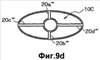 В случае овальных стволов скважин комбинация из двух или более позиционирующих устройств предпочтительно используется для корректного позиционирования множества разных скважинных приборов. Для позиционирования прибора 101 акустического каротажа в овальном стволе скважины оба устройства 10А и 10В предпочтительно приводятся в действие при всех рычагах, приводимых от двигателя. На фиг.9с показано устройство 10В с рычагами 20а , 20b , 20с и 20d , которые все приводятся в действие посредством двигателя. В тех случаях, когда в овальном стволе скважины желательно выполнить каротаж со смещением от центра на короткой оси (например, с использованием прибора 105 для плоскостного каротажа, выполняющего каротаж по короткой оси в овальном стволе скважины), позиционирующее устройство 10С должно быть приведено в действие одной парой рычагов при включенном двигателе и другой парой рычагов при невключенном двигателе. На фиг.9d показано, что устройство 10С предпочтительно приводится в действие с рычагами 20с и 20d , приводимыми в действие посредством двигателя, и рычагами 20а и 20b , не приводимыми в действие посредством двигателя. При работе, подобной описанной, существенно большее давление создается вдоль одной оси, что обеспечит принудительное совмещение данной оси с длинной осью ствола скважины. Это создает возможность предпочтительного выставления скважинного прибора, такого как зонд 105 плоскостного каротажа, относительно короткой оси.