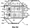 На фиг.9а-9d показана приведенная в качестве примера скважинная каротажная система, в которой предусмотрены несколько позиционирующих устройств 10А, 10В, 10С, 10D для выставления различных скважинных приборов (например, прижимного зонда 105 плотностного каротажа; прибора 101 акустического каротажа) в стволе скважины в различных предпочтительных ориентированных положениях для обоих случаев – то есть для круглого и овального стволов скважин. В некоторых вариантах осуществления, и как показано на фиг.9а, может быть предусмотрен шарнирный отклонитель 120 для обеспечения разъединения между различными позиционирующими устройствами. На фиг.9а показаны позиционирующие устройства 10А и 10В, которые в случае круглого ствола скважины используются как центратор и в которых рычаги 20а, 20b, 20с и 20d устройства 10А и аналогичные рычаги устройства 10В установлены в активном положении под действием приводного усилия. Это обеспечивает центрированное положение прибора 101 акустического каротажа. Однако некоторые скважинные приборы, такие как прижимной зонд 105 плотностного каротажа, должны быть установлены в заданном положении со смещением от центра. В случае круглых стволов скважин устройство 10D может быть использовано для установки скважинного прибора со смещением от центра посредством предпочтительной подачи мощности к некоторым рычагам, при этом обеспечиваются преимущества по сравнению с обычными устройствами для установки со смещением от центра, выполненными с листовыми рессорами, например, вследствие способности устройства 10D обеспечивать избирательный отвод при проходе через узкие сечения.