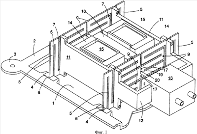 Стенки 11 несут на своих обращенных друг к другу сторонах по сердечнику 14, выполненному из магнитомягкой стали, с тремя взаимосвязанными параллельными стержнями, средний из которых на фигуре скрыт катушкой 15 электромагнита, через обмотку которой он проходит.