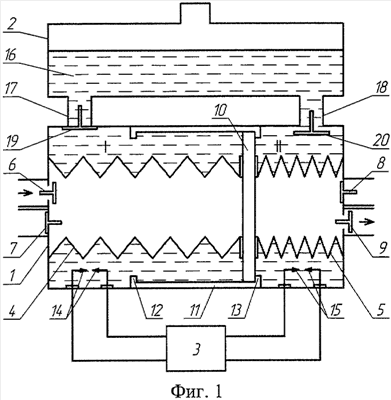 Далее от блока 3 управления закрывается электроклапан 20, а элоктроклапан 19 открывается, и на электроды 15 подается импульс высокого напряжения, в результате которого между электродами происходит электрический разряд, под действием которого в зоне электродов 15 за счет большой плотности энергии происходит импульсное парообразование жидкости 16, приводящее к увеличению давления внутри полости II, что вызывает осевое перемещение перегородки 10 с сильфонами 4 и 5 таким образом, что сильфон 4 сжимается, а сильфон 5 растягивается, происходит выдавливание жидкости и пара из полости 1 через открытый электроклапан 19, трубку 17 в бак 2 и одновременно сжатие газа внутри сильфона 4, в результате чего закрывается впускной клапан 6 и открывается выпускной клапан 7, а в растягивающемся сильфоне 5 открывается впускной клапан 8 и закрывается выпускной клапан 9.