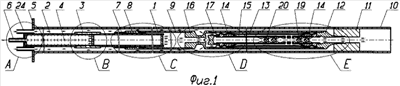 Жидкость (показана стрелками на фиг.6), находящаяся в цилиндре 7 и в полости кожуха 9, вытесняется плунжером 1 в пространство между мембраной 13 и корпусом 17 через каналы 22 (см. фиг.4) в головке 16. В момент понижения давления Р до нуля длина штока 2 становится меньше первоначальной его длины, например на 963 мм, за счет энергии упругих деформаций и плунжер 1 частично выходит из цилиндра 7, создавая разрежение в сообщающихся полостях. Скважинная жидкость (показана стрелками на фиг.3) через проходное отверстие в пакере 11 и основании 12 поступает в клапанную трубку 15 и открывает впускные клапаны 19. Далее жидкость поступает в пространство между мембраной 13 и клапанной трубкой 15 через отверстия 18.