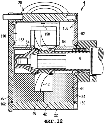 Направляющая 92 зафиксирована в корпусе 20 посредством шести пар головок 158 штифтов. Шесть головок 158 штифтов, которые расположены перед направляющей 92 на фиг.12, показаны на фиг.12. Остальные шесть головок 158 штифтов находятся за направляющей 92 на фиг.12. Головки 158 штифтов могут иметь большую ширину, чем стержни штифтов, и могут быть соответственно установлены по прессовой посадке в аксиальном направлении или ввинчены в торцевые крышки 24 и 26, и могут быть установлены по прессовой посадке в радиальном направлении или ввинчены в цилиндрическую трубу 22.