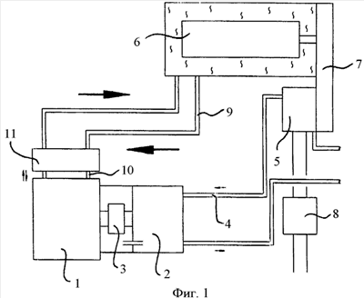 Винтовой компрессорный агрегат 1 охлаждается в данном случае посредством охлаждающего контура 9 не показанного транспортного средства. Для этой цели масляный контур 10, необходимый для охлаждения винтового компрессорного агрегата 1, связан через теплообменник 11 с охлаждающим регулируемым термостатом контуром 9 транспортного средства.