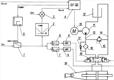 Рабочая жидкость из бака 12, расположенного на уровне, обеспечивающем нормальный режим всасывания насоса 11, нагнетается насосом 11, ротор которого вращается с частотой, пропорциональной напряжению U упрэд, через фильтр 16 в полость исполнительного механизма. В результате выходное звено исполнительного механизма перемещается со скоростью, пропорциональной величине управляющего сигнала. Рабочая жидкость отводится от исполнительного механизма через магистраль 14 в бак 12.