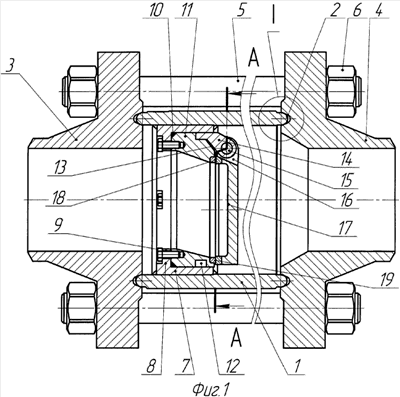 На фиг.1 изображен продольный разрез затвора обратного; на фиг.2 – разрез по А-А на фиг.1; на фиг.3 – узел I на фиг.1 (вариант).