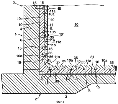 После установки стержней 35 создают сплошной, герметичный по жидкости и пару экран 20 на передних сторонах 10b панелей 10а с формированием в результате внешнего защитного слоя 10. Таким путем вокруг стержней 35, приемных гаек (не показаны) и окружающего внешнего защитного слоя 10 может быть обеспечено непроницаемое для текучей среды соединение. Экран 20 более наглядно показан на фиг.2.