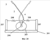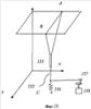 Чтобы обеспечить колебания светодиодов только в одной плоскости, может быть натянуто несколько тросов в плоскости, перпендикулярной скорости светодиодов. Пример наиболее простой такой системы показан на Фиг.15. Изменяя расстояние между точками А и В, можно изменять разницу между резонансными частотами 1 и 2 для колебаний в плоскостях zx и zy. Если частота возбуждения e находится между частотами 1 и 2 то амплитуды и фазы колебаний с частотой e в плоскостях zx и zy будут различны. В результате траектория светодиодов будет представлять собой эллипс, плоскость которого параллельна плоскости ху. В этом случае формируемое светодиодами изображение оказывается расположенным на выпуклой и вогнутой поверхностях. Если частота возбуждения равна 1, то колебания имеют место практически в одной плоскости.
