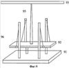 Обычно длина стержня составляет около 3-4 метров. Такая механическая развертка может использоваться для показа изображений вместо обычных транспарантов. Возможность легко и быстро производить смену показываемого изображения, относительно небольшой вес, возможность показывать изображение в темное время суток являются несомненными преимуществами такого устройства. Стержень может быть сделан телескопическим. При этом он напоминает телескопическую удочку. В этом случае его длина в собранном состоянии менее одного метра, диаметр менее двух сантиметров, а вес менее одного килограмма. Можно высказать предположение, что подобные устройства для показа изображений в будущем вытеснят традиционные транспаранты. На Фиг.9 показано устройство, в котором в качестве механической колебательной системы также используется упругий стержень 92 или пластина, например рессора от автомобиля. Колебания в пластине возбуждаются на частоте, при которой в пластине имеется 2 узла и 3 пучности. Пластина шарнирно прикрепляется к неподвижным опорам 96 в тех местах, где у нее находятся узлы колебаний. Шарниры не передают вращательные колебания пластины 92 на неподвижные опоры 96, прикрепленные к неподвижному основанию 91. Платформа 93 с модулируемыми по яркости точечными источниками света прикреплена к верхнему концу вертикального штока 95, нижний конец которого прикреплен к пластине 92 в том месте, где в пластине находится пучность колебаний. Колебания в пластине 92 возбуждаются путем приложения к пластине периодической внешней силы. В частности, периодическая внешняя сила может быть получена при помощи устройств, описанных в пунктах 10-12 формулы изобретения.