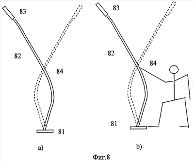 Наиболее простой и в то же время наиболее привлекательной колебательной системой является длинный упругий стержень 82, показанный на Фиг.8а. Стержень представляет собой механическую колебательную систему с распределенными параметрами, которая имеет бесконечное количество собственных частот, каждая из которых соответствует определенному типу колебаний. Наиболее приемлемым для рассматриваемого применения является колебание, имеющее 2 узла и 2 пучности, как показано на Фиг.8b. Здесь упругий стержень 82 упирается своим нижним концом в неподвижную базу 81, например землю. К верхнему концу стержня прикреплена платформа 83 с модулируемыми по яркости точечными источниками света, в качестве которых обычно используются светодиоды, управляемые микроконтроллером. Колебания могут возбуждаться различными способами, например рукой человека, путем подергивания стержня вблизи узла колебаний. В этом случае прилагаемые к стержню усилия минимальны, а смещение стержня в этом месте составляет не более одного сантиметра, что выгодно отличает такое устройство от известного устройства, показанного на Фиг.7, где человек вынужден снижать скорость до нуля в крайних положениях, а затем снова разгонять светодиоды.