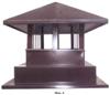 Основу устройства «Двойного декоративного защитного колпака на печную трубу» составляет кровлеобразная четырехскатная крышка, состоящая из двух частей. Верхняя часть (1) представляет собой кровлеобразную четырехскатную конструкцию, выполненную из листовой стали, и осуществляющую контроль всей системы от попадания различного рода осадков, как на выходной конец печной трубы, так и внутрь. Угол наклона скатов выбран 35-40 градусов, что в зимнее время обеспечивает беспрепятственное схождение снега.