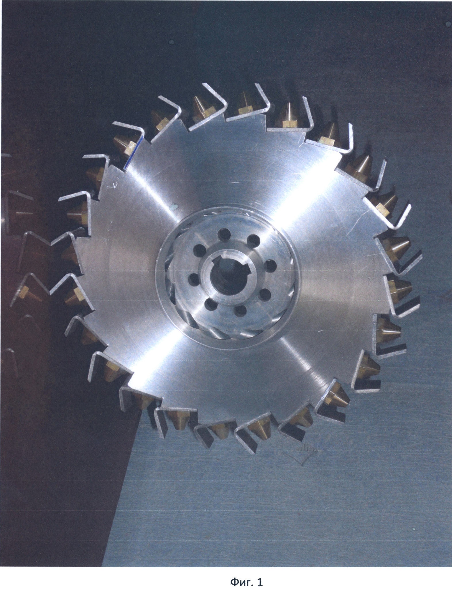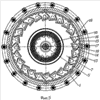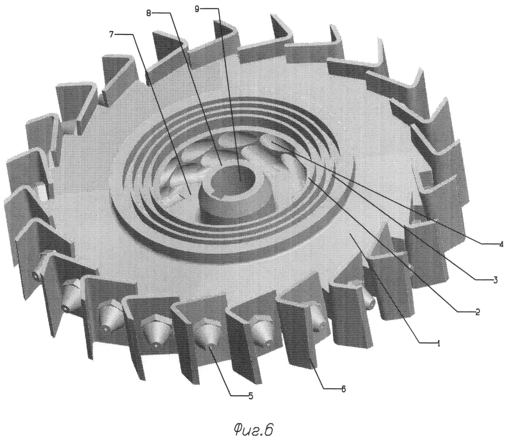 Одним из результатов работы на стендовой энергоустановке было создание колеса центробежного, известного как [2] – Заявка РФ – RU 2006142667 А1, опубл. 27.05.2008, представленного на Фиг.1-2 и рассматриваемого в данной заявке в качестве колеса-аналога, выполненного с конфузорами, чередующимися с лопатками, расположенными на выходе каналов, радиально отходящими от периферии колеса, и с двухпоточным гидродинамическим проточным тактом, имеющим двухсторонний осевой вход, показавшего на испытаниях достаточно высокую эффективность преобразования энергии электрического тока в тепловую энергию жидкости даже при относительно невысоких оборотах вращения.