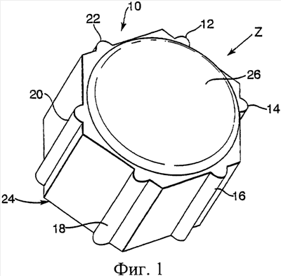 На фиг.1 показан керамический элемент брони 10. Керамический элемент брони 10 имеет шестигранную форму в разрезе, при рассмотрении элемента в направлении, указанном Z. Керамический элемент брони 10 имеет зубья 12, 14, 16, 18, 20, 22 на каждой стороне керамического элемента брони. Элемент имеет плоскую нижнюю поверхность 24 и выпуклую верхнюю поверхность 26. Выпуклая верхняя поверхность позволяет рассеивать энергию от первоначального воздействия снаряда по большей площади, чем если бы элемент имел плоскую верхнюю поверхность.