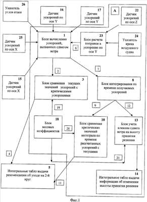 1. Устройство для определения сдвига ветра, воздействующего на воздушное судно, включающее датчик ускорений, блок наличия сдвига ветра и информационное табло, отличающееся тем, что оно снабжено блоком измерения величины сдвига ветра, совмещенным с блоком наличия сдвига ветра, выполненным в виде взаимосвязанных между собой блока вычисления ускорений, вызванных сдвигом ветра, один из входов-выходов которого через блок сравнения текущих значений ускорений с критическими значениями связан с входом интегрального табло выдачи рекомендаций об уходе на второй круг, а другой выход связан с входом блока интегрирования по времени получаемых ускорений, при этом один из входов-выходов блока интегрирования по времени получаемых ускорений через блок сравнения критических значений интеграла по времени с текущими значениями интеграла ускорений по времени соединен через вход с информационным интегральным табло 5 выдачи рекомендаций об уходе на второй круг, причем блок интегрирования по времени получаемых ускорений через вход блока учета влияния сдвига ветра на высоту принятия решения соединен с интегральным табло выдачи информации об изменении высоты принятия решения, при этом устройство включает, по меньшей мере, четыре датчика ускорений, соответственно, два датчика по оси Х и два по оси Y, выходы которых связаны с входом блока вычисления ускорений, вызванных сдвигом ветра.