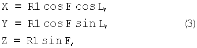 Пересчет прямоугольных координат X, Y, Z в географические F, L, R возможен путем решения следующей системы уравнений: