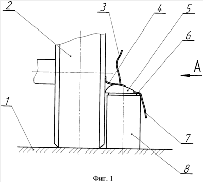 Принцип работы прибора следующий. На основание 1 вблизи управляемого колеса 2 (на расстоянии 2-3 см от боковой поверхности его шины) устанавливают подставку 8 с компьютерным ковриком 6. На коврик 6 кладут мышь 5 таким образом, чтобы ее свободный конец контактировал с поверхностью шины. В этом положении фиксируют мышь 5 с колесом 2 при помощи эластичной клеящейся ленты типа «скоч», один конец которой наклеивают на верхнюю поверхность мыши 5, а другой – на поверхность шины колеса 2. При необходимости (при отсутствии в мыши 5 встроенных элементов электропитания) подключают мышь 5 к источнику электропитания. Сигнализатор начала поворота управляемых колес готов к работе. Повертывают рулевое колесо, например, влево – наступает момент поворота управляемого колеса 2 влево, при котором его шина воздействует на мышь 5. При этом мышь 5 взаимодействует с ковриком 6 – включается световой сигнализатор мыши 5 и одновременно загорается сигнальная лампа. Производят установку нуля на приборе. Световой сигнализатор мыши 5 отключается автоматически – сигнальная лампа гаснет. Повертывают рулевое колесо вправо – соответственно наступает момент поворота управляемого колеса 2 вправо, при котором мышь 5 перемещается в этом же направлении посредством ленты 4. В результате включается световой сигнализатор мыши 5 и одновременно загорается сигнальная лампа. Фиксируют по прибору полученное значение люфта в градусах.