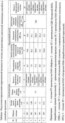 Заявленным способом и способом-прототипом были испытаны образцы топлив для реактивных двигателей (см. таблицу).
