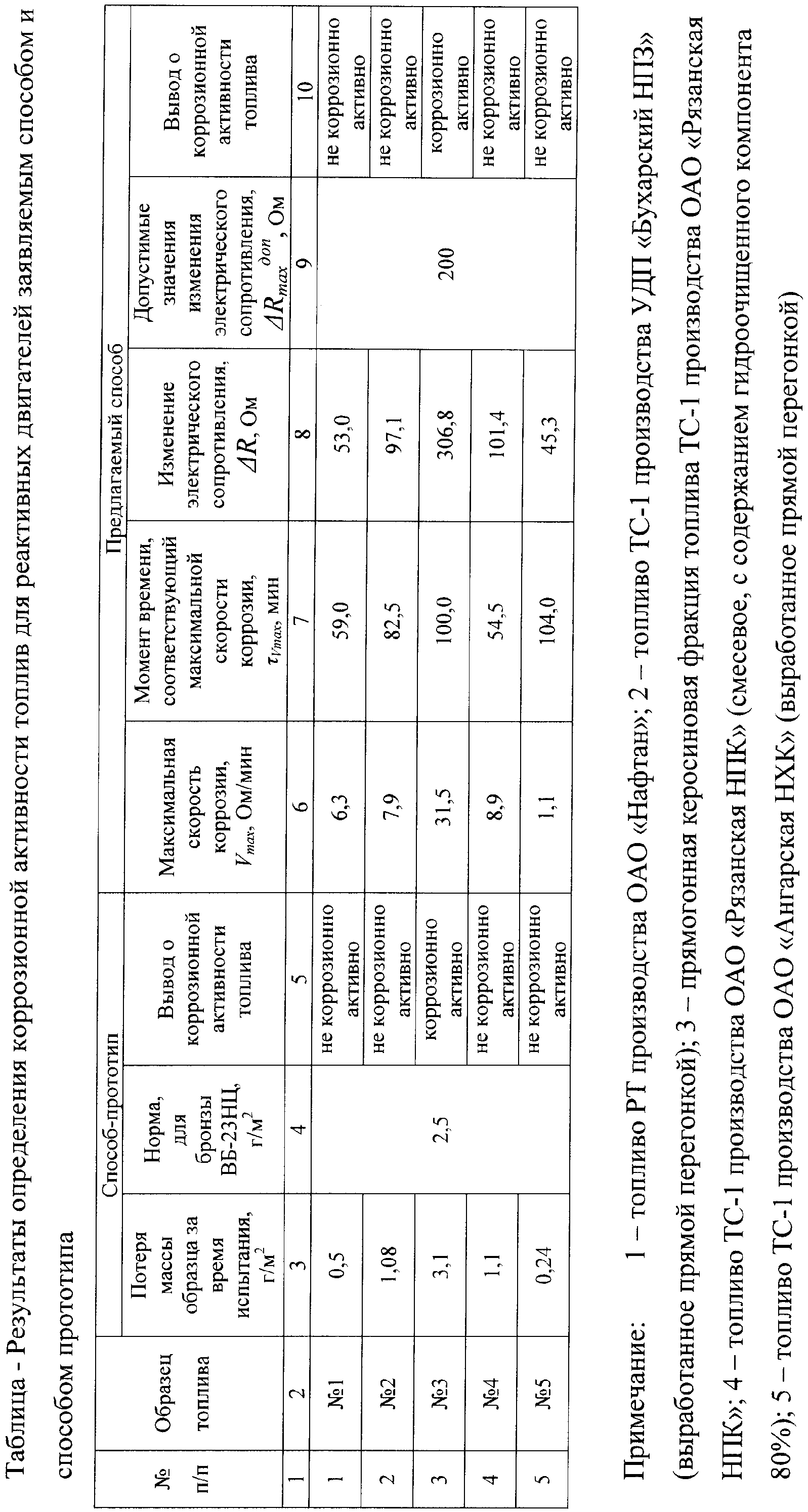 Как видно из результатов испытаний, приведенных в таблице, заявляемый способ позволяет подразделять топлива по уровню их коррозионной активности: наиболее коррозионно-активным является образец 3 ( R=306,8 Ом), наименее коррозионно-активным является образец 5 ( R=45,3 Ом). Заявляемый способ хорошо коррелирует со способом прототипа, однако, в отличие от него, позволяет прогнозировать ресурс работы топливных насосов высокого давления авиационных газотурбинных двигателей.