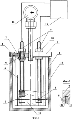 Устройство (фиг.1) содержит реакционную емкость 1 – стальной цилиндр, на фланец которого устанавливается крышка 2. Крышка 2 закрепляется накидной гайкой 3. Для герметизации реакционной емкости 1 между ней и крышкой 2 устанавливается резиновое уплотнительное кольцо 4. Внутри реакционной емкости 1 размещают стеклянный стакан 5 с испытуемым топливом 6. В крышке 2 имеются два отверстия для установки электродов 7, в нижних торцах которых выполнены прорези и перпендикулярно этим прорезям отверстия с резьбой для винтов 8. Электроды 7 электроизолированы от крышки 2 уплотнительными втулками 9 и закреплены гайками 10.