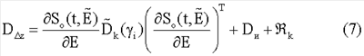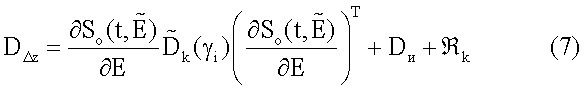 и математическим ожиданием, близким к нулю. В выражении (7) – матрица частных производных от вектора наблюдения по вектору экстраполированных параметров  – ковариационная матрица экстраполированных значений дисперсий; Dи – ковариационная матрица дисперсий шумов наблюдения; – тензор, учитывающий члены разложения выше первого порядка при линеаризации уравнения наблюдения;