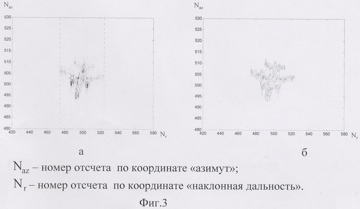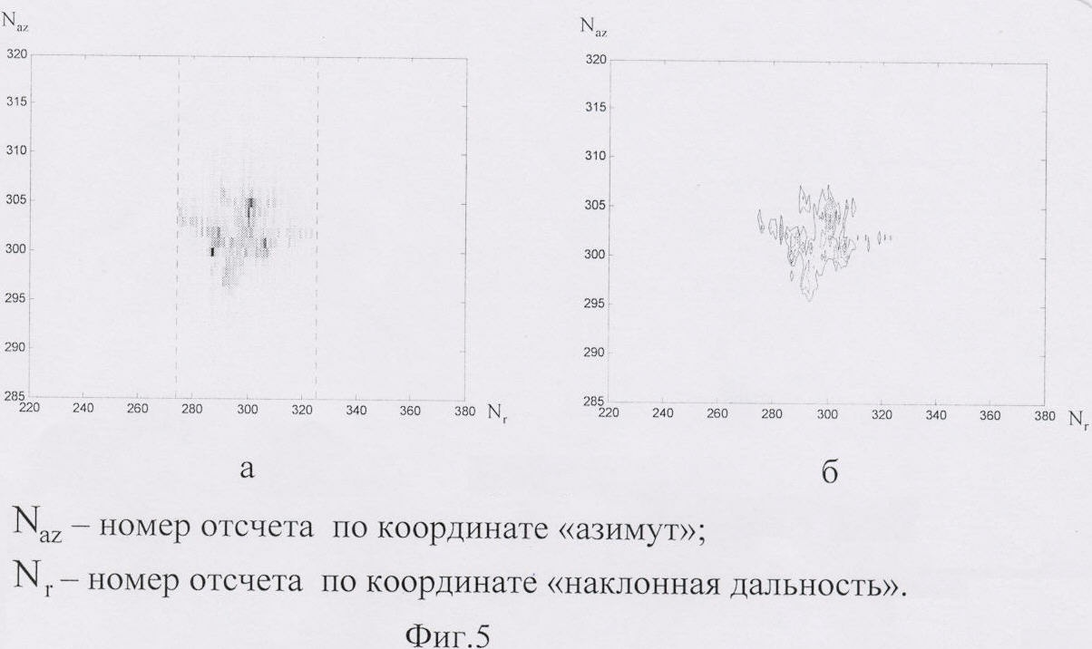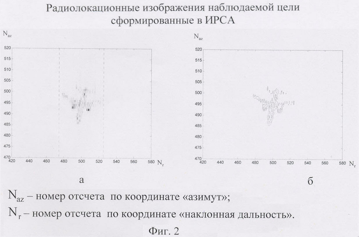 На фигурах 2-5 представлены РЛИ наблюдаемой воздушной цели в координатах азимут Naz – наклонная дальность Nr, сформированные в ИРСА, где фигуры 2а-5а представляют собой радиолокационные изображения воздушной цели, выполненное в градациях серого, а фигуры 2б-5б отображают контурные радиолокационные портреты воздушной цели по уровню половинной яркости сформированного РЛИ.