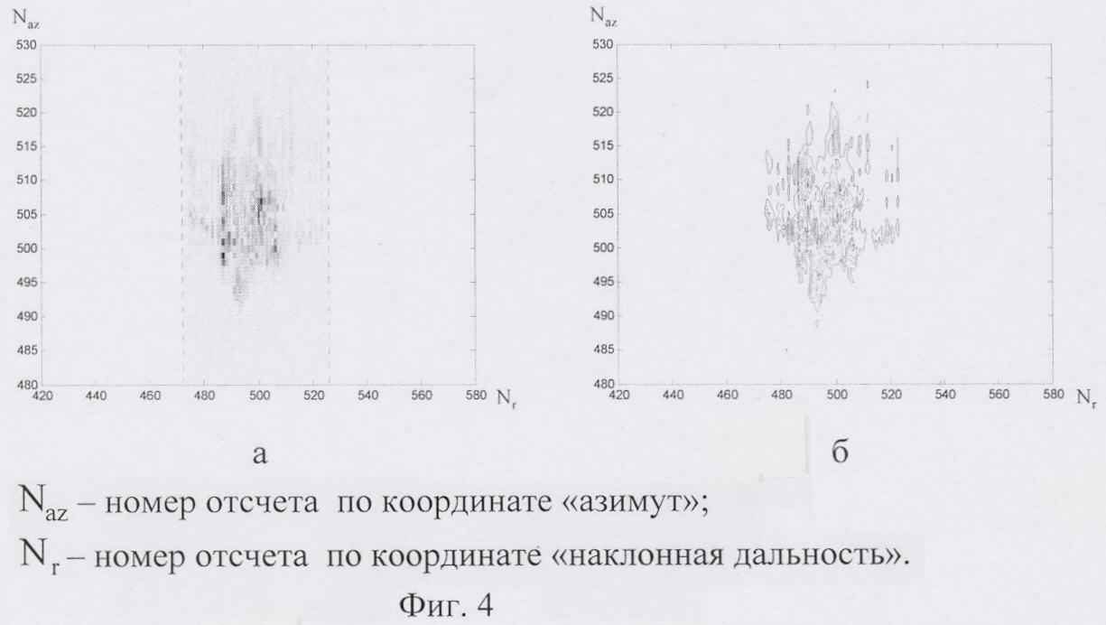 На фигуре 2 представлено РЛИ наблюдаемой воздушной цели в координатах азимут Naz – наклонная дальность Nr, сформированное в ИРСА при полностью известных параметрах движения цели и сфокусированное точно в центр масс летательного аппарата. Время синтезирования апертуры составляет 1,5 с. Пунктирной линией на фигуре изображены границы стробов дальности, используемых при обработке сигнала в ИРСА.