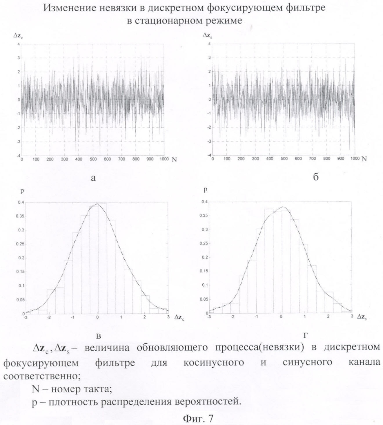 На фигуре 7 представлены зависимости невязок zc и zs от дискретного времени N в отдельности для синусного и косинусного каналов системы обработки при стационарном режиме работы (фигура 7 а, б) и их плотности распределения вероятностей р (гистограммы) (фигура 7 в, г).